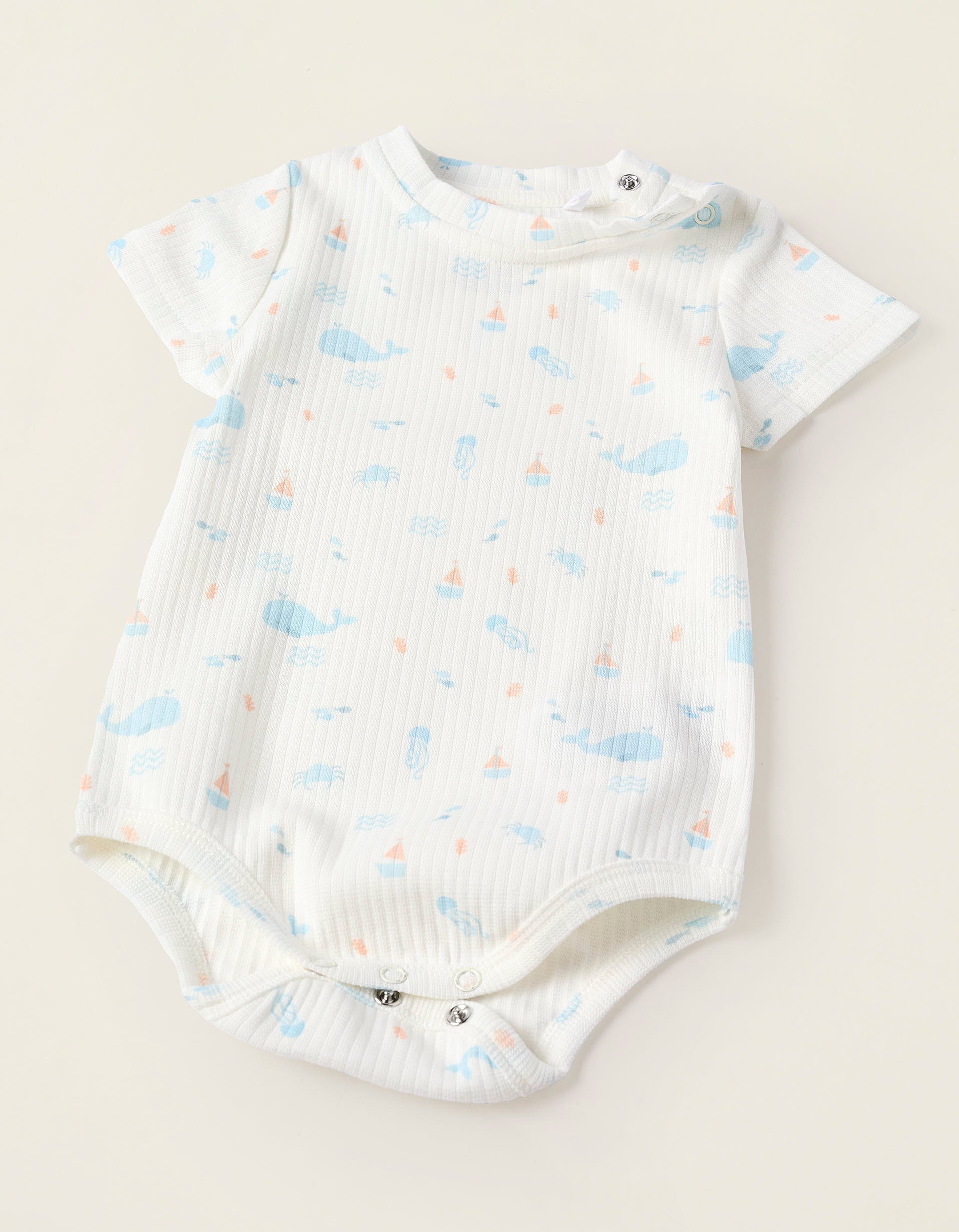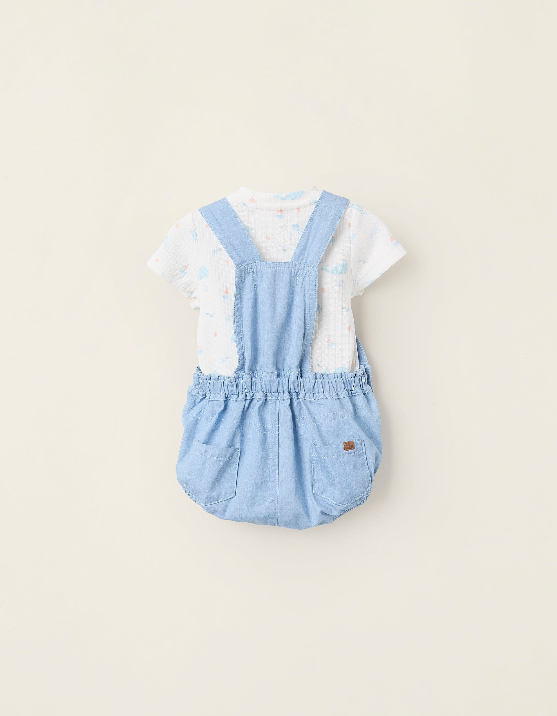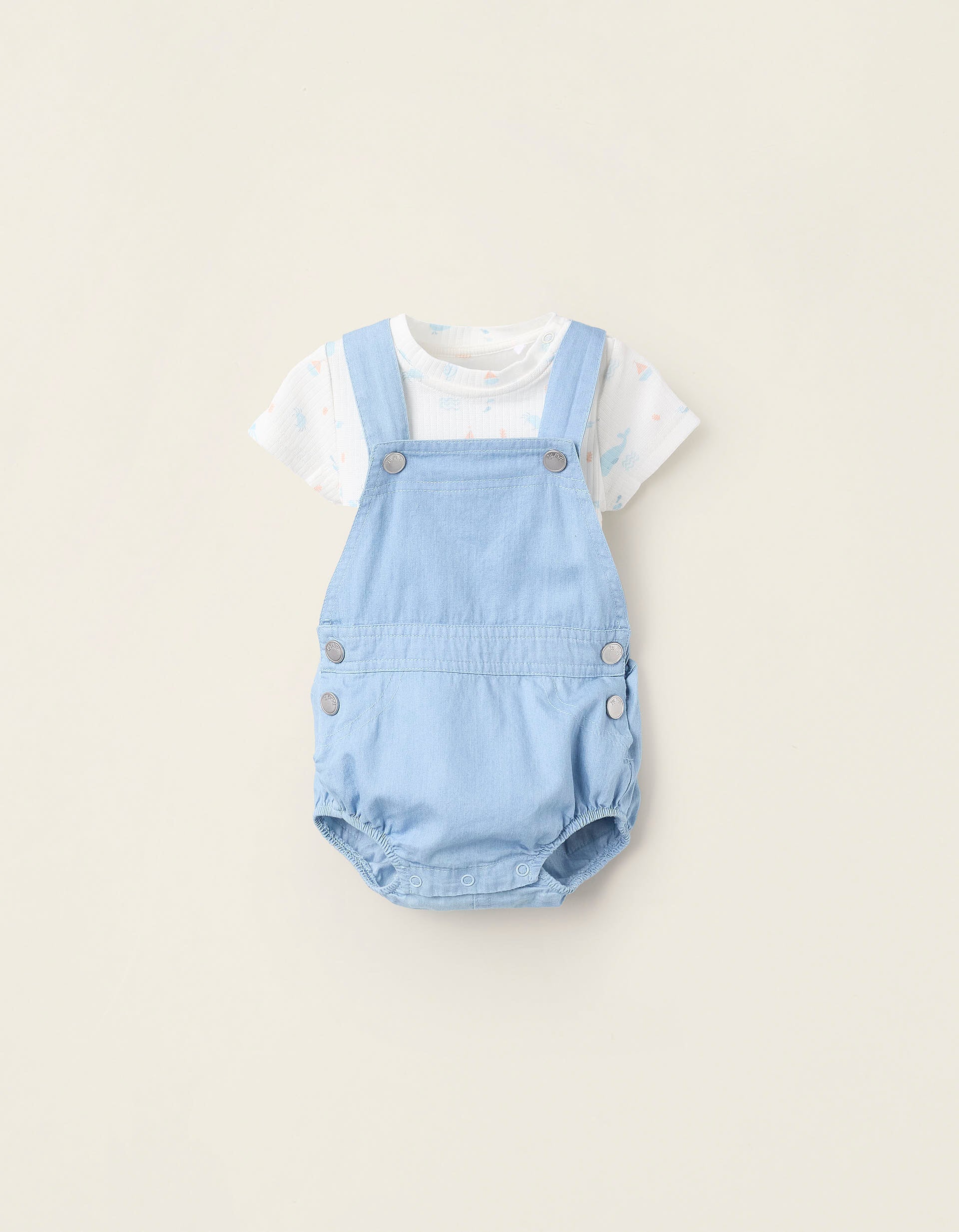 Conjunto de dos piezas para recién nacido, 100% algodón. Está compuesto por un body acanalado con motivo de ballenas, cangrejos, medusas, entre otros; y un peto corto de mezclilla ligera, con dobladillos elásticos para un ajuste perfecto. Un set suave y cómodo, para usar juntos o por separado.
