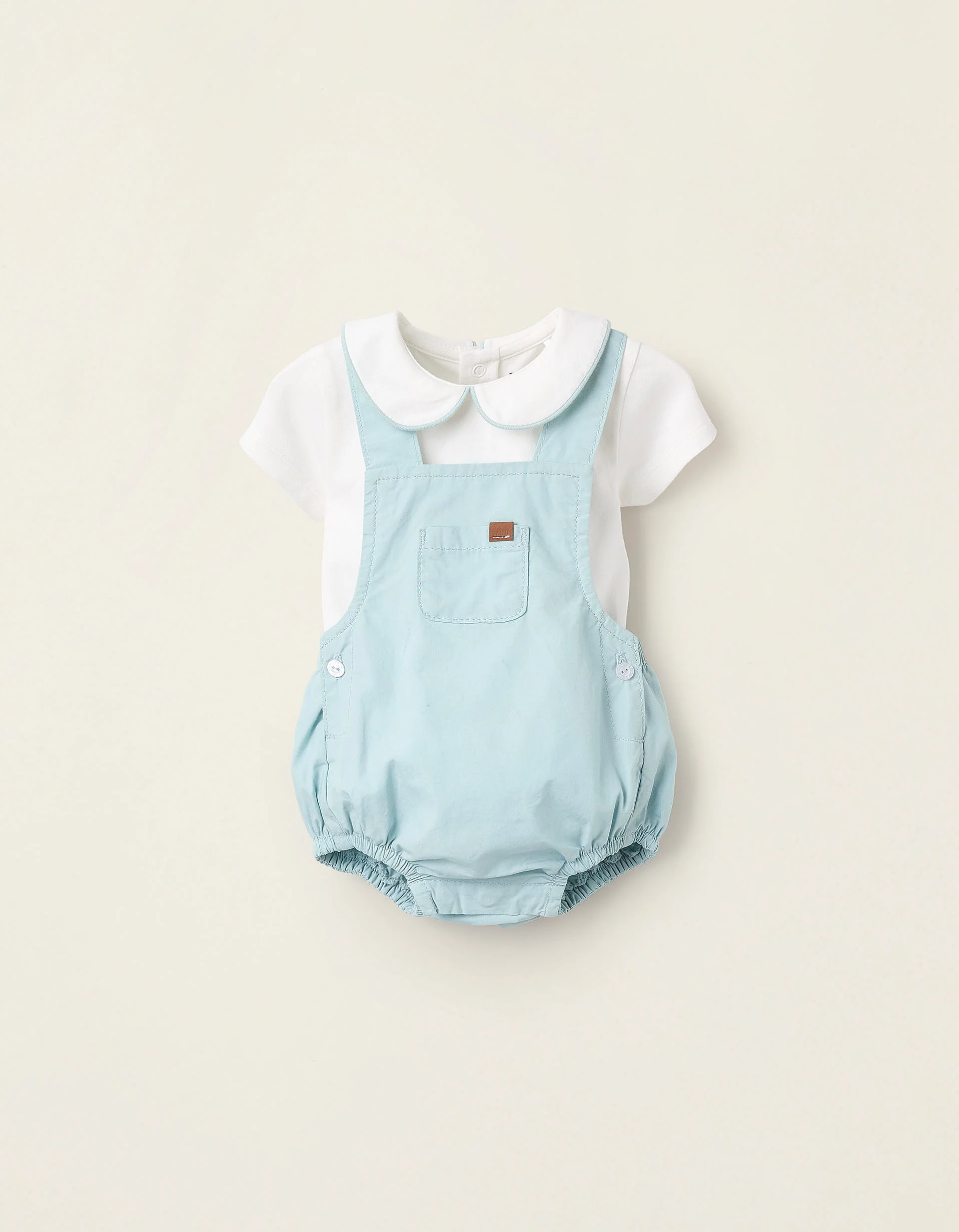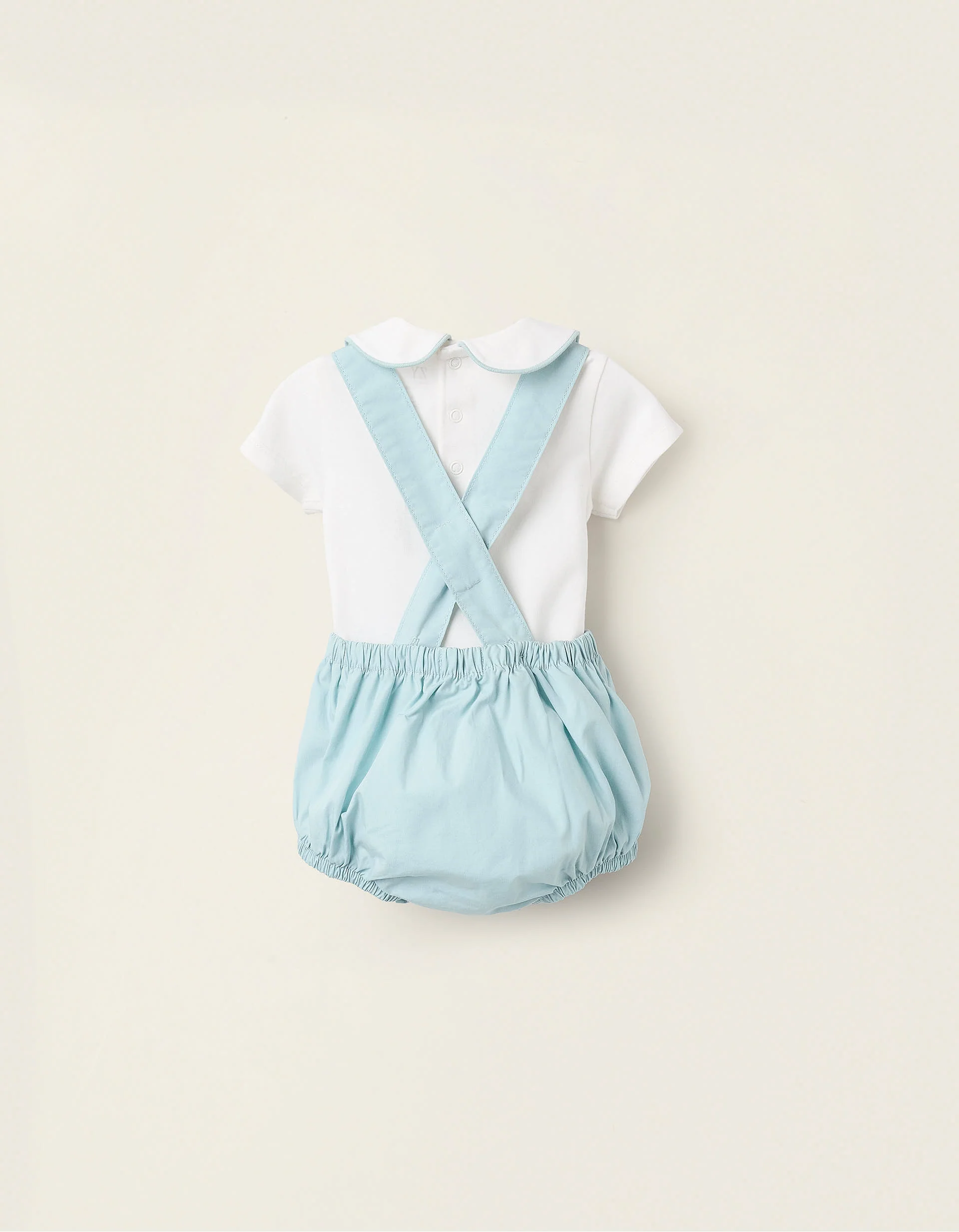 Conjunto de dos piezas para recién nacido. Está compuesto por un body blanco con cuello Peter Pan, en algodón flexible para mayor comodidad y libertad de movimientos. Incluye también un peto corto, 100% algodón, con bolsillo en el pecho. Cintura y dobladillos elásticos para un ajuste perfecto. Tirantes ajustables. ¡Un set cómodo y adorable!