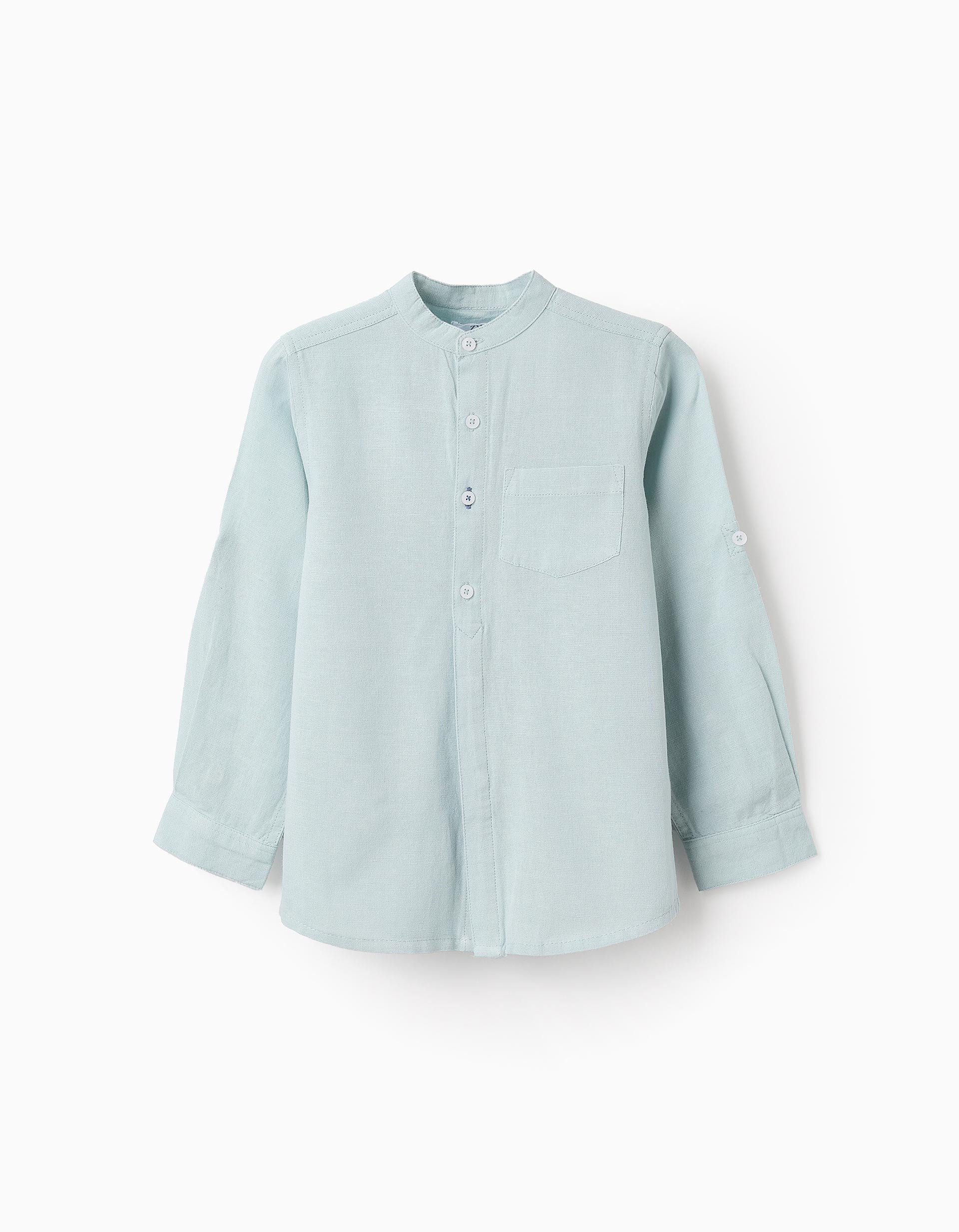 Camisa de manga larga verde agua para niño, fabricada en una mezcla de viscosa, algodón y lino. Cuello mao. Mangas plegables con botones.Bolsillo en el pecho. Se abrocha con botones: visibles en la parte superior e invisibles en la parte inferior. Un básico del armario. Big Me: un botón con hilo y ojal a contraste para que el niño identifique fácilmente dónde empezar a abotonar, promoviendo su autonomía.