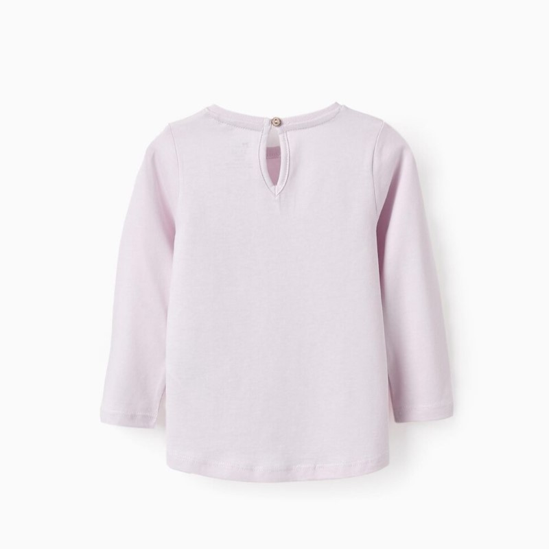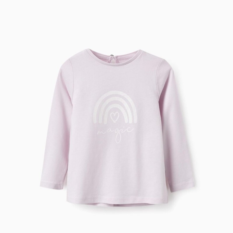 Camiseta lila para bebé, 100% algodón. Estampado frontal de arcoíris con purpurina. Base ligeramente asimétrica. Botón en la espalda.