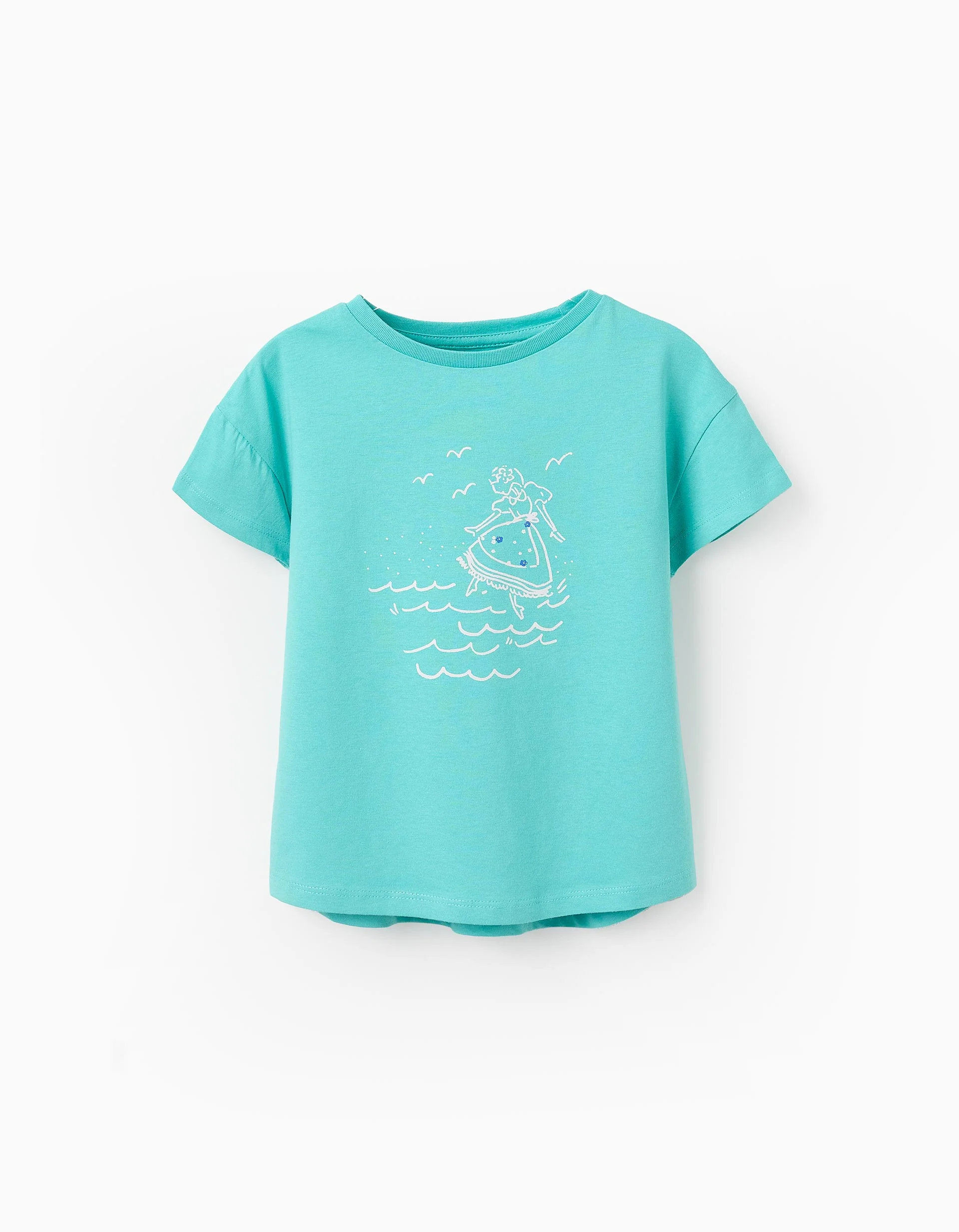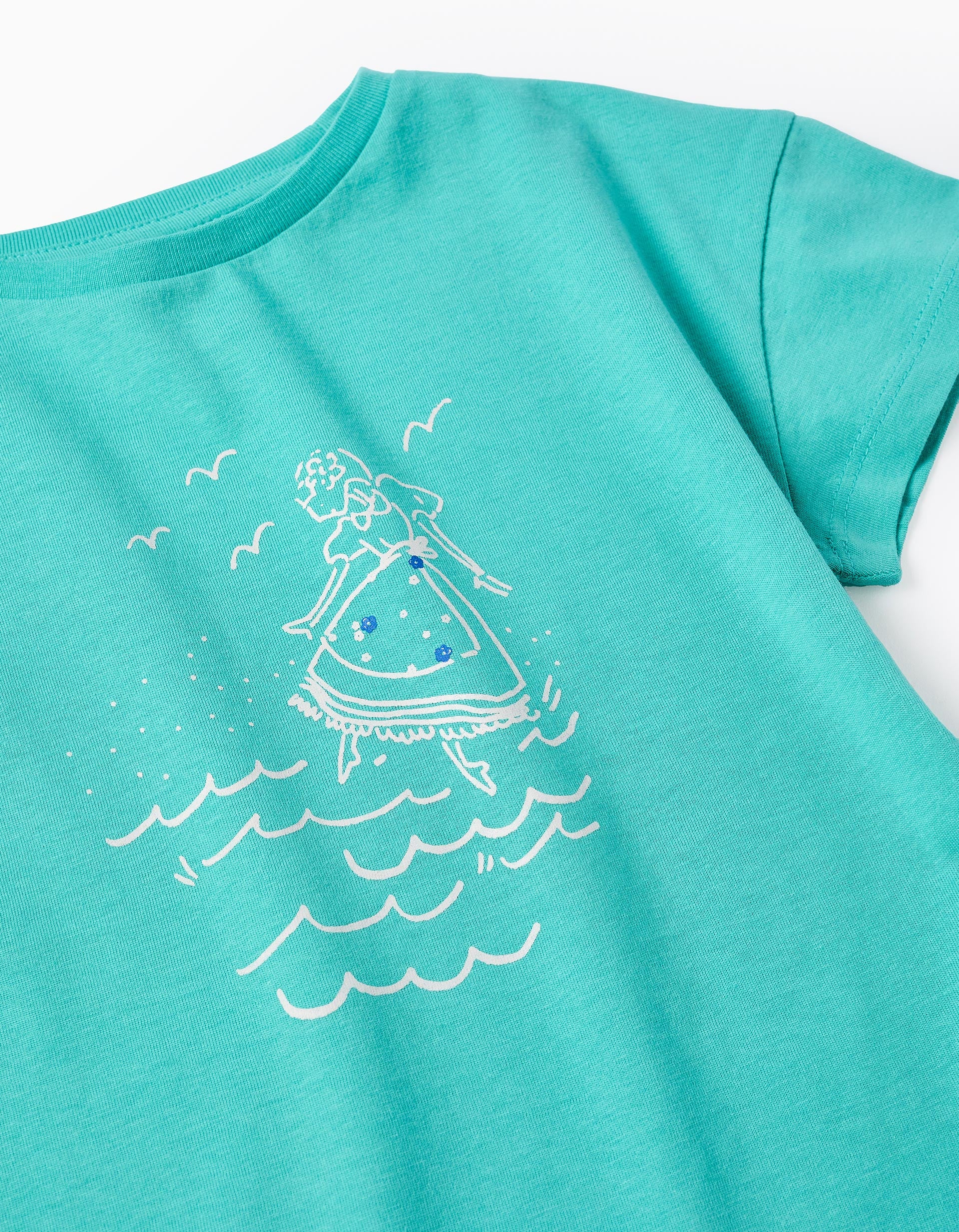 Camiseta de manga corta verde para niña, 100% algodón. Estampado frontal. Base ligeramente asimétrica, un poco más larga en la parte trasera. Hombros caídos para un estilo más relajado. Etiqueta interior estampada para no irritar la piel. ¡Para los looks del día a día! We Care: artículo con certificado Oeko-Tex Standard 100, que garantiza la ausencia de sustancias nocivas o irritantes para la piel.