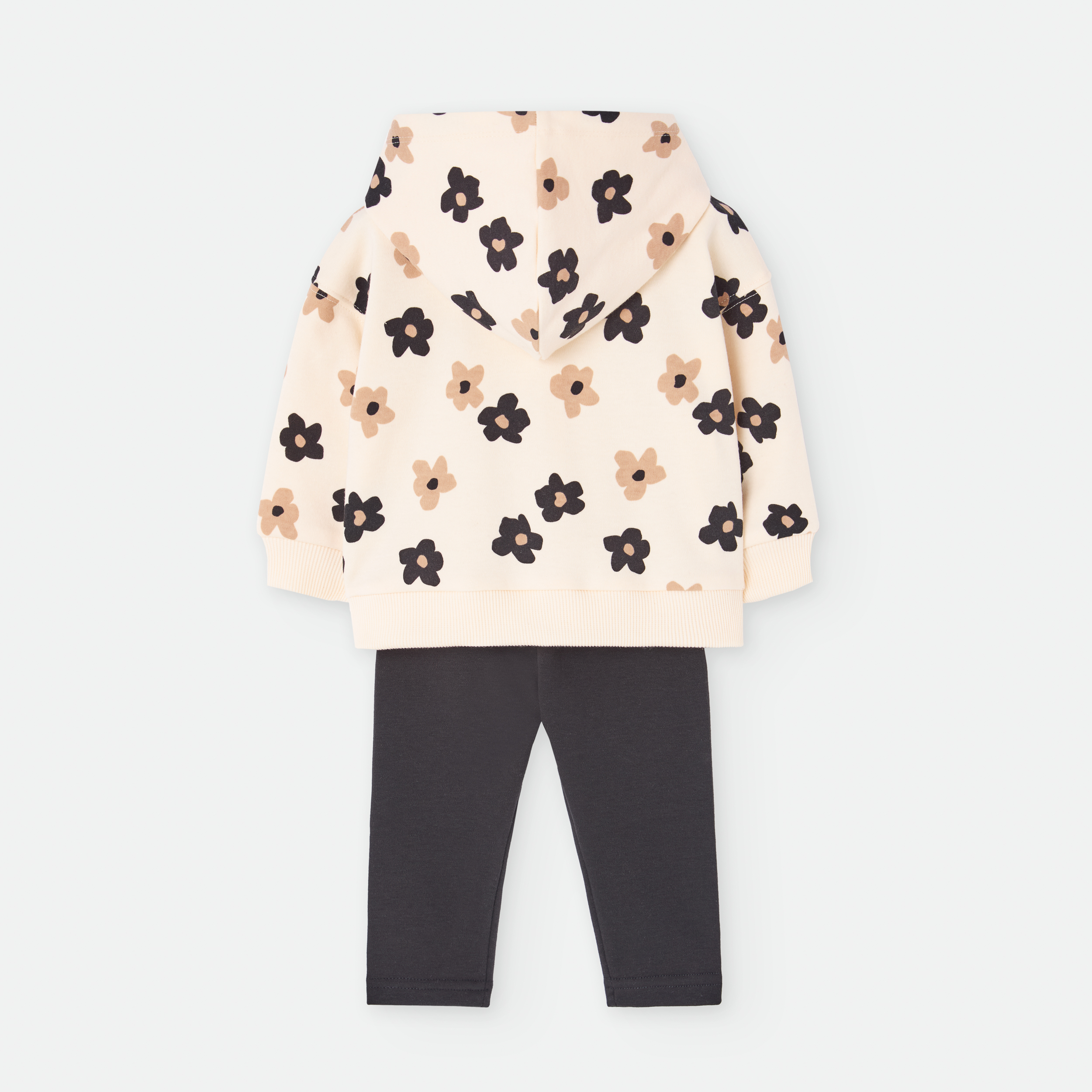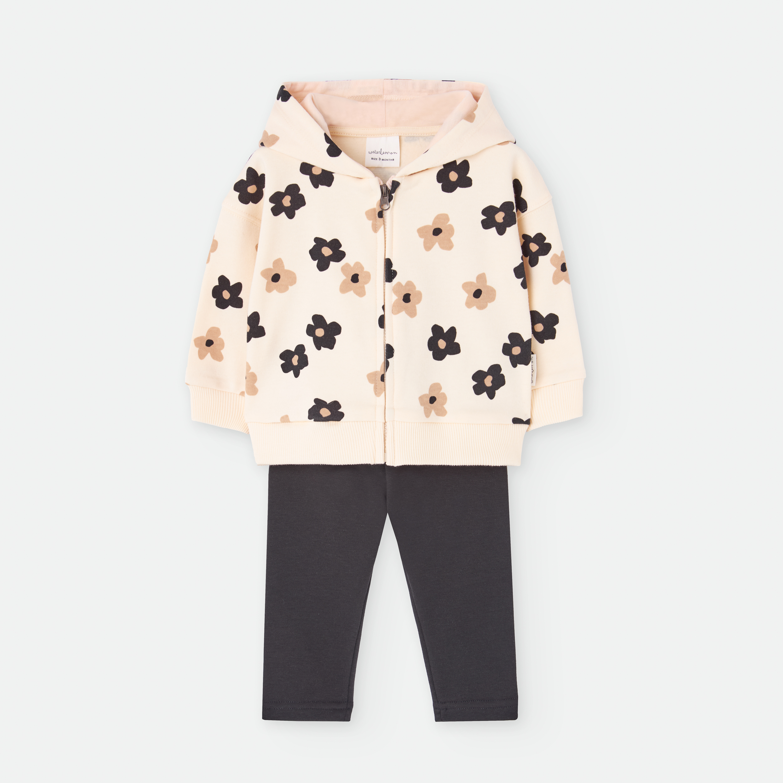 Conjunto niña bebé. Fabricado en 10% algodón. Sudadera con cremallera y capucha en estampado de flores con pelito en el interior.
