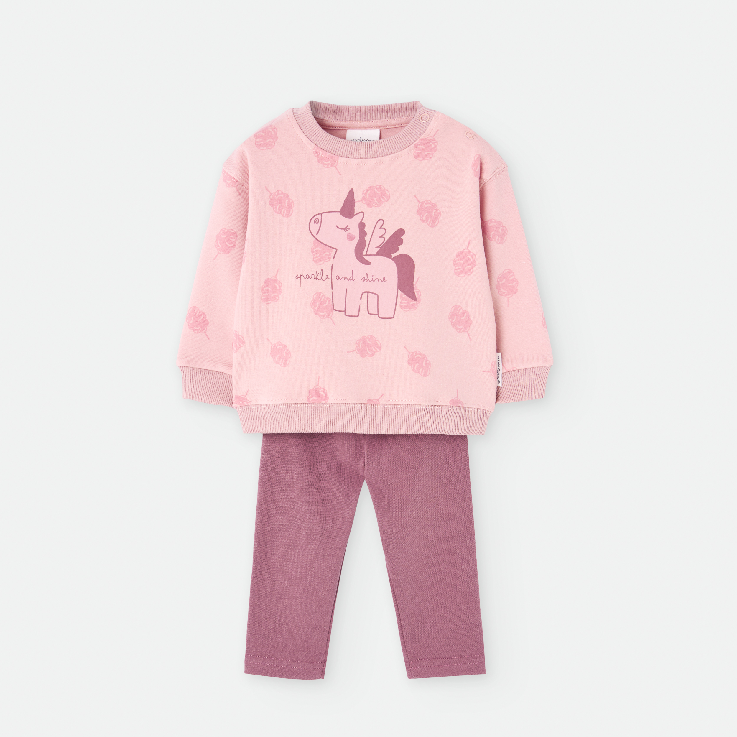 Conjunto niña bebé. Fabricado en 10% algodón. Sudadera rosa con estampado de unicornio y puños acanalados. Legging en rosa mas fuere. Forrado de pelito por dentro.