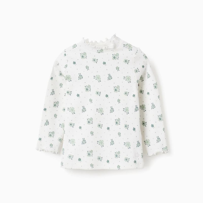 Camiseta de manga larga blanca para bebé niña, en algodón acanalado y flexible. Estampado floral. Cuello alto y puños con acabado enrollado y ondulado. Automáticos en el hombro para vestir fácilmente.