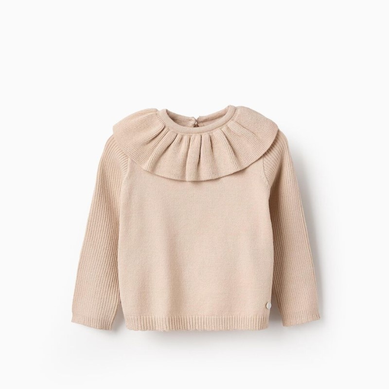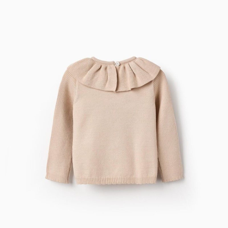 Jersey de punto beige para niña bebé, con volantes en el cuello y en los puños. Botón en la espalda para vestir fácilmente. Un jersey suave y elegante.