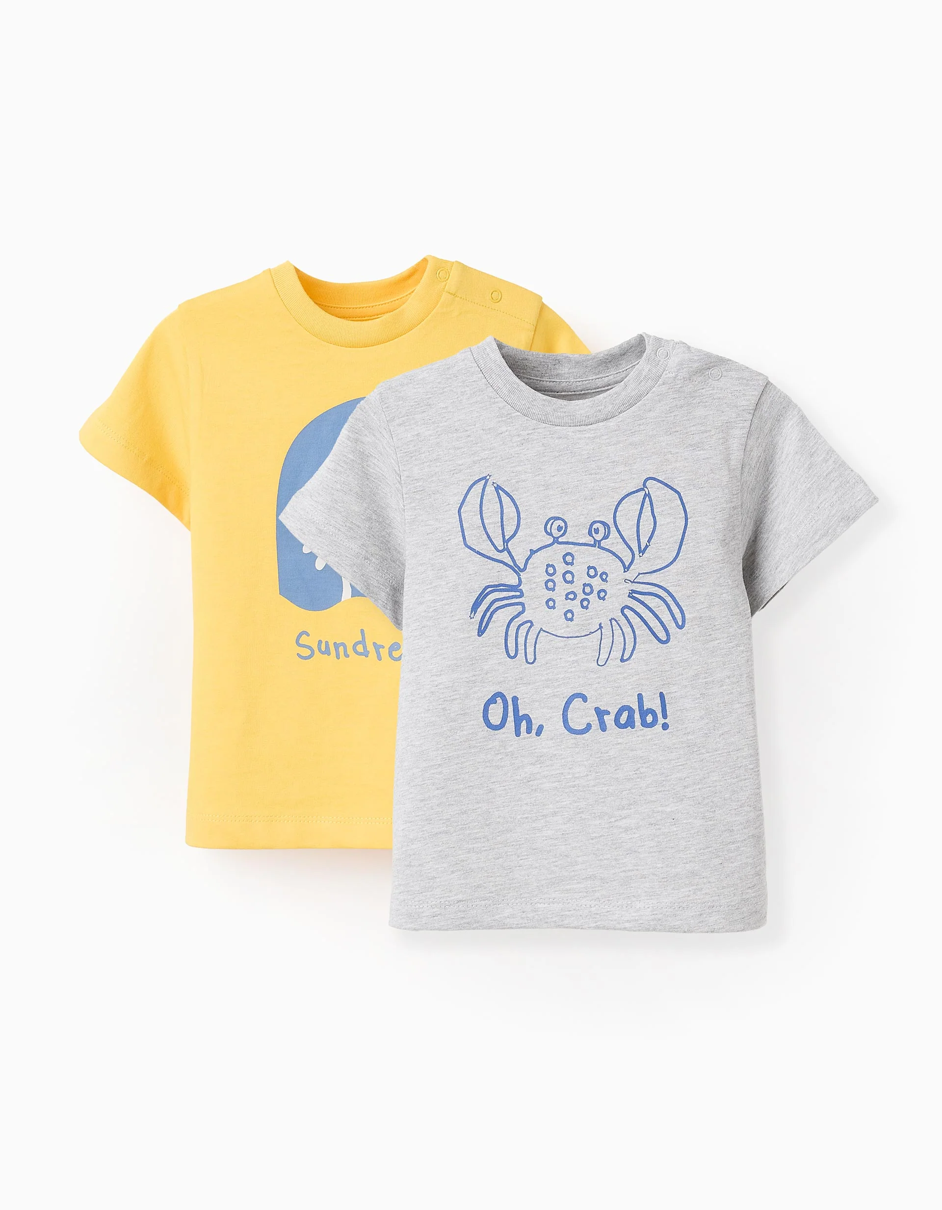 Pack de dos camisetas para bebé niño, 100% algodón. Incluye una camiseta gris y una amarilla, ambas con estampado frontal. Automáticos en el hombro para vestir fácilmente. Etiquetas interiores estampadas para no irritar la piel. ¡Para los diferentes looks del día a día! We Care: artículo con certificado Oeko-Tex Standard 100, que garantiza la ausencia de sustancias nocivas o irritantes para la piel.