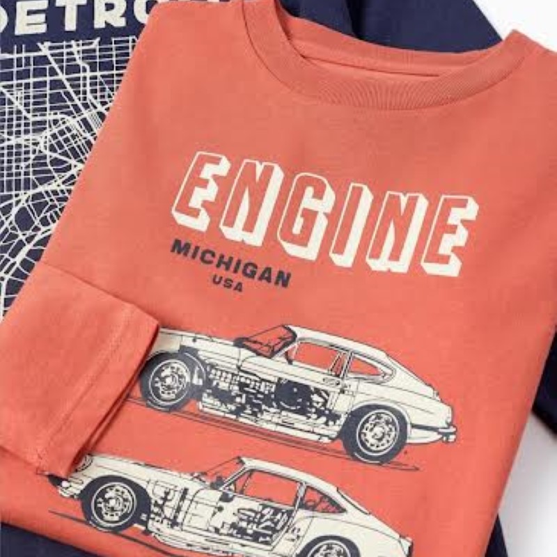 Pack de dos camisetas de manga larga para niño, una naranja y una azul oscuro, ambas con estampado frontal. Cuello acanalado para vestir fácilmente.