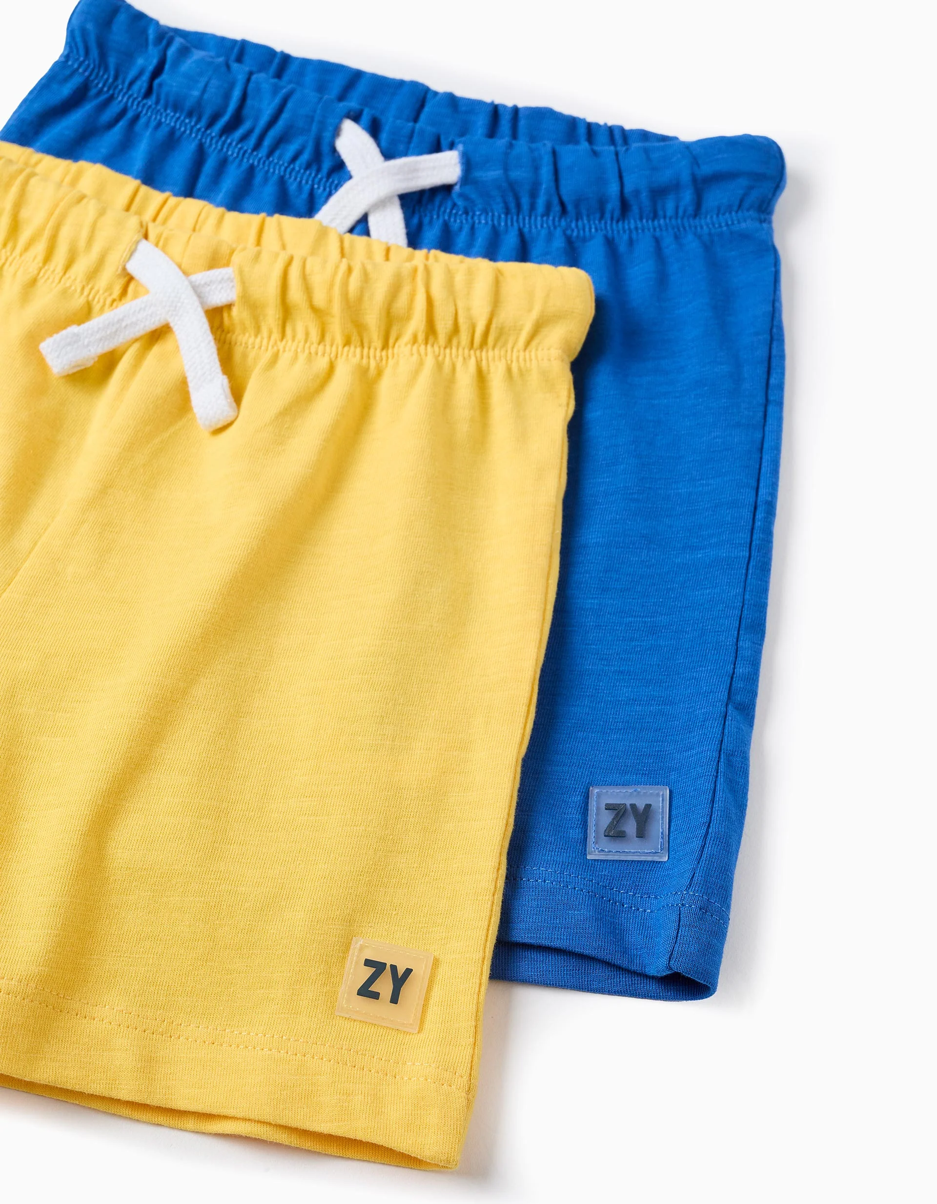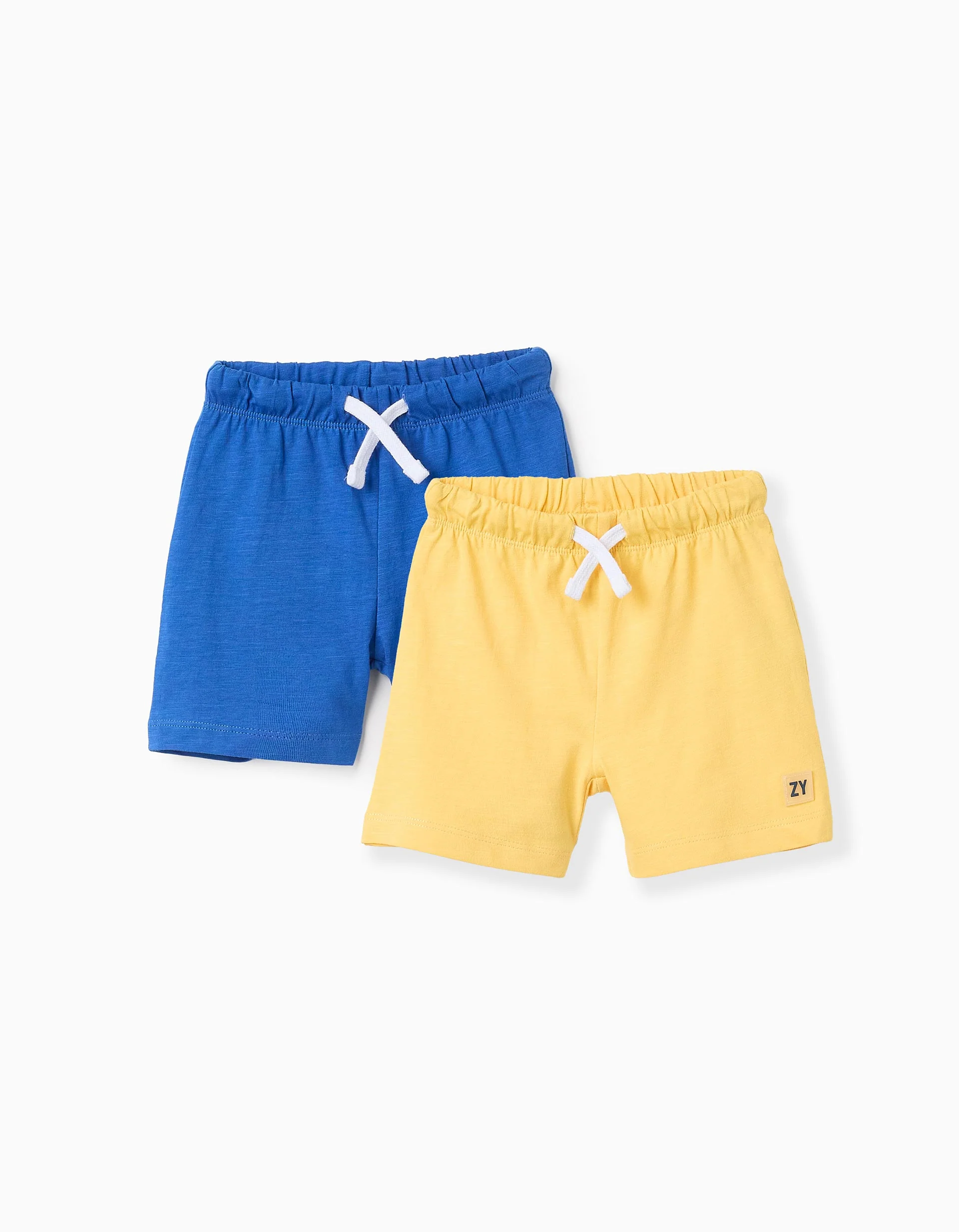Pack de dos pantalones cortos para bebé niño, en jersey 100% algodón. Incluye un pantalón corto azul y un amarillo. Cinturas elásticas con cordón. Bolsillo posterior. Etiqueta de la marca en goma en el lateral. ¡Un conjunto de pantalones cortos ligeros, suaves y cómodos!