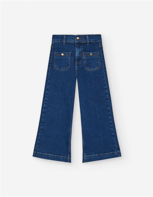 Pantalón vaquero azul para niña, con elasticidad para mayor comodidad y libertad de movimiento. Cintura elástica ajustable en el interior con elástico y botones.