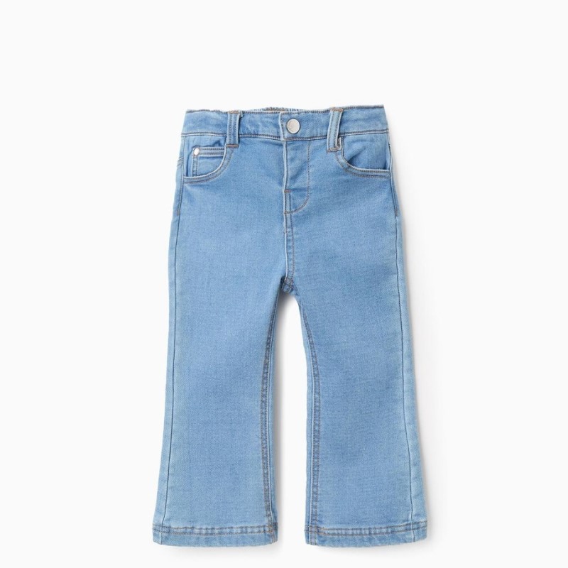 Pantalón vaquero azul para bebé niña, en denim algodón con un toque de elasticidad para mayor comodidad y libertad de movimiento. Cintura elástica y botón de presión en la parte delantera, para vestir con facilidad. Cintura ajustable.
