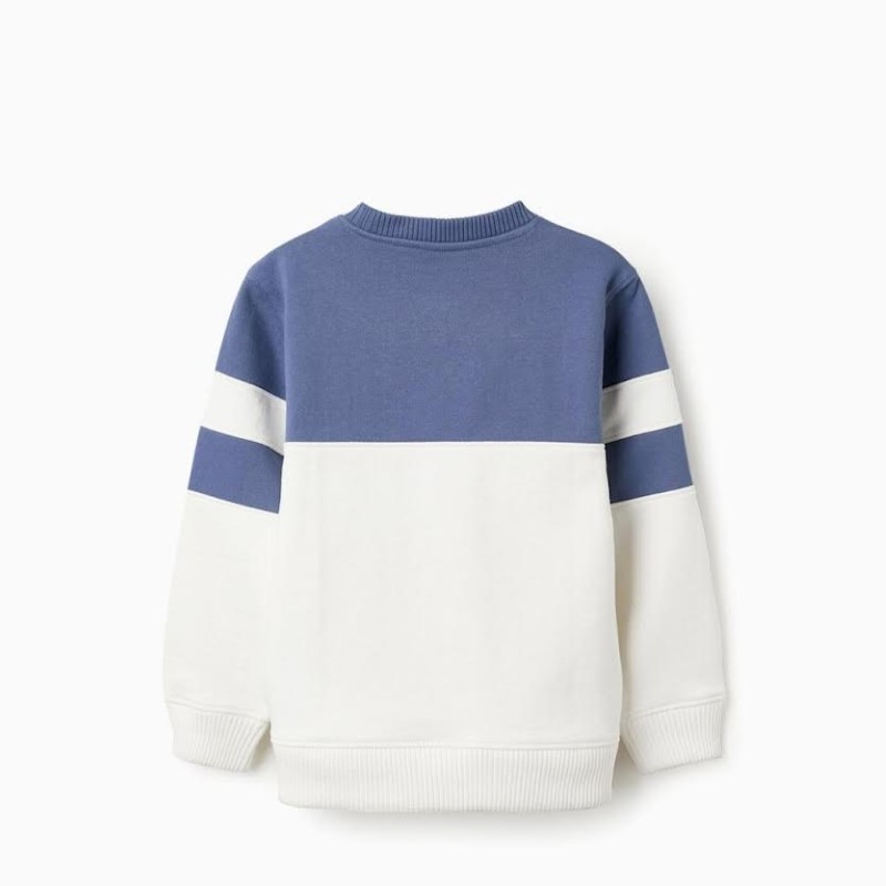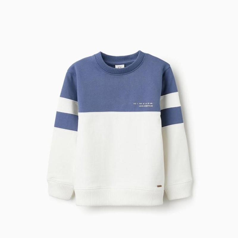 Sudadera azul y blanca para niño, 100% algodón, en bloques de color. Frase en el pecho. Puños acanalados para un ajuste perfecto. Cuello acanalado para vestir fácilmente.