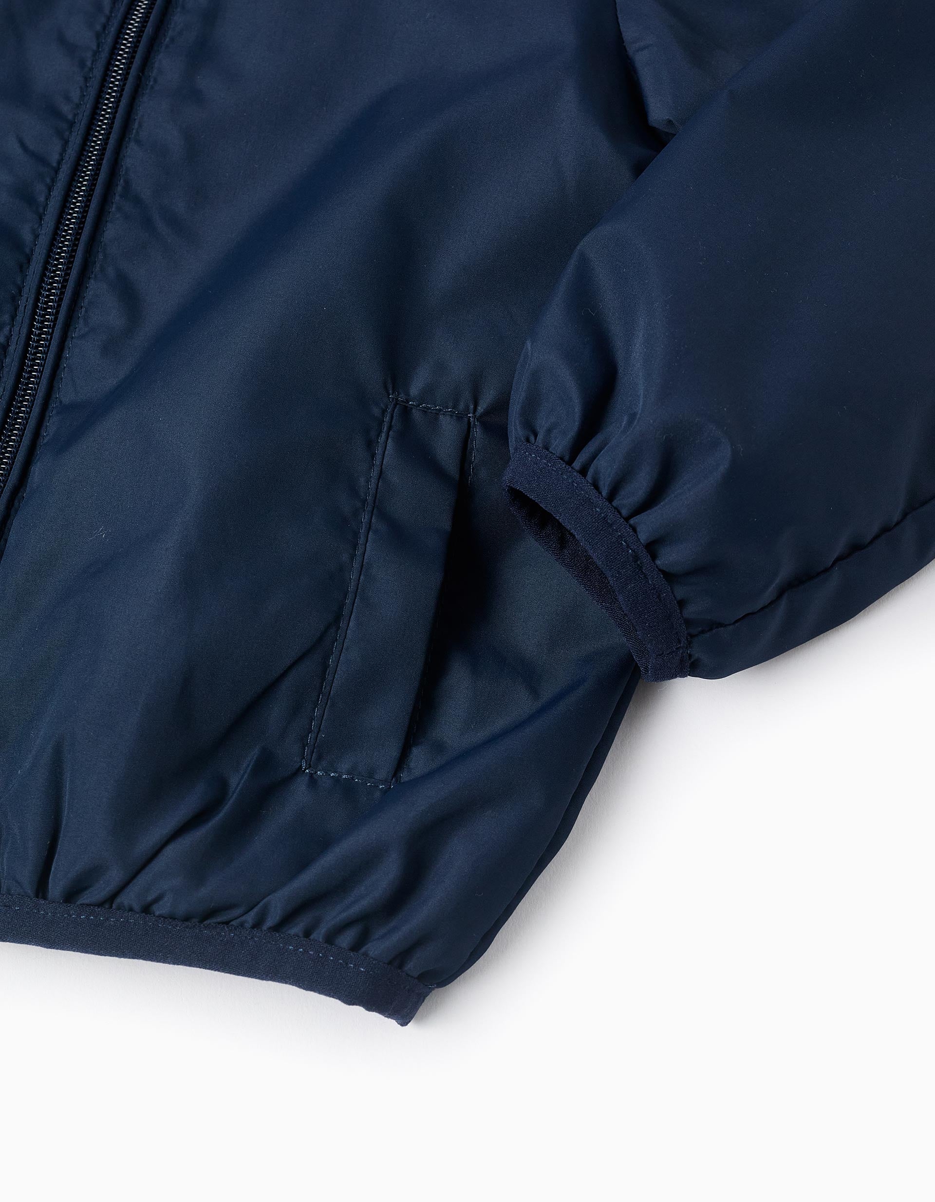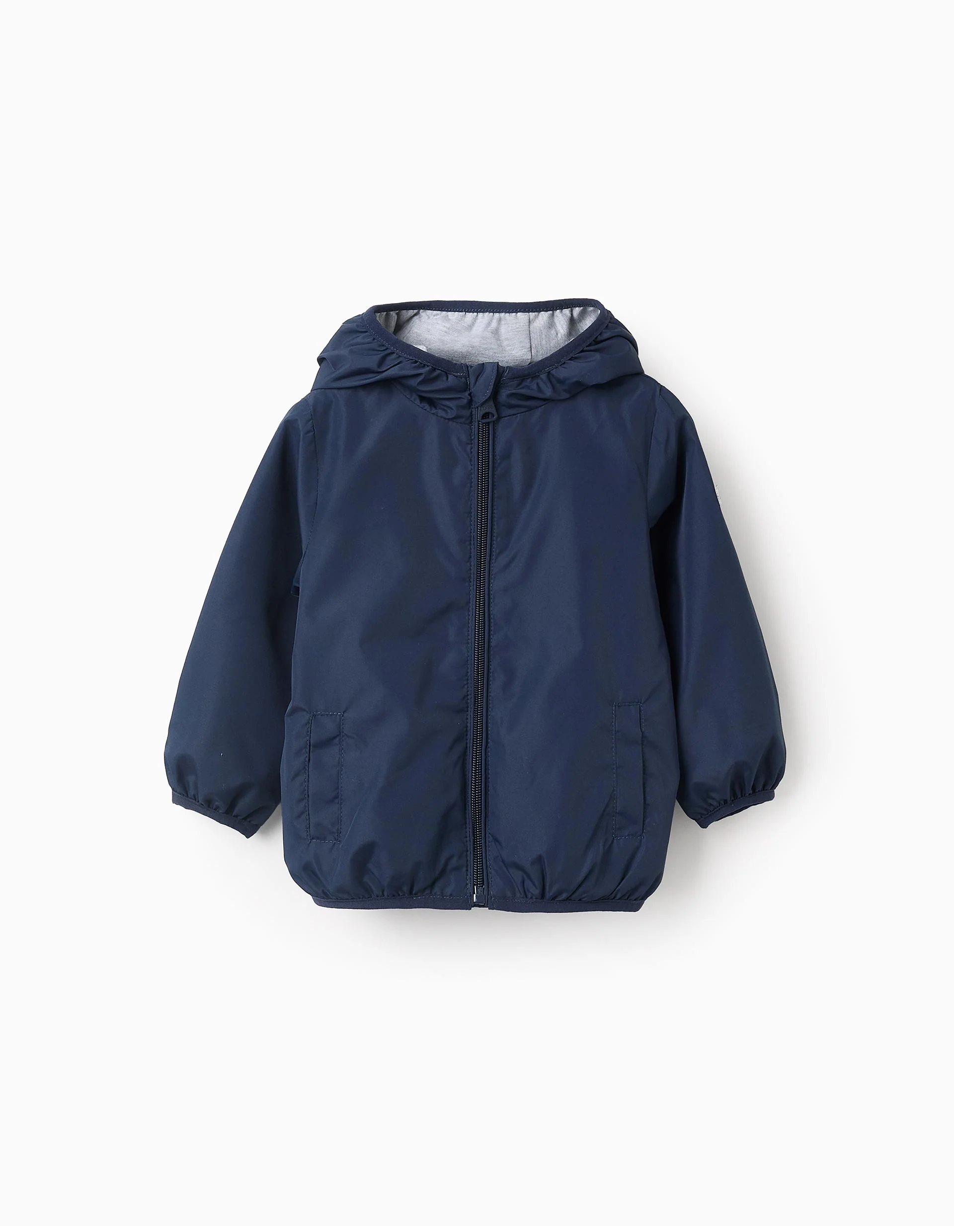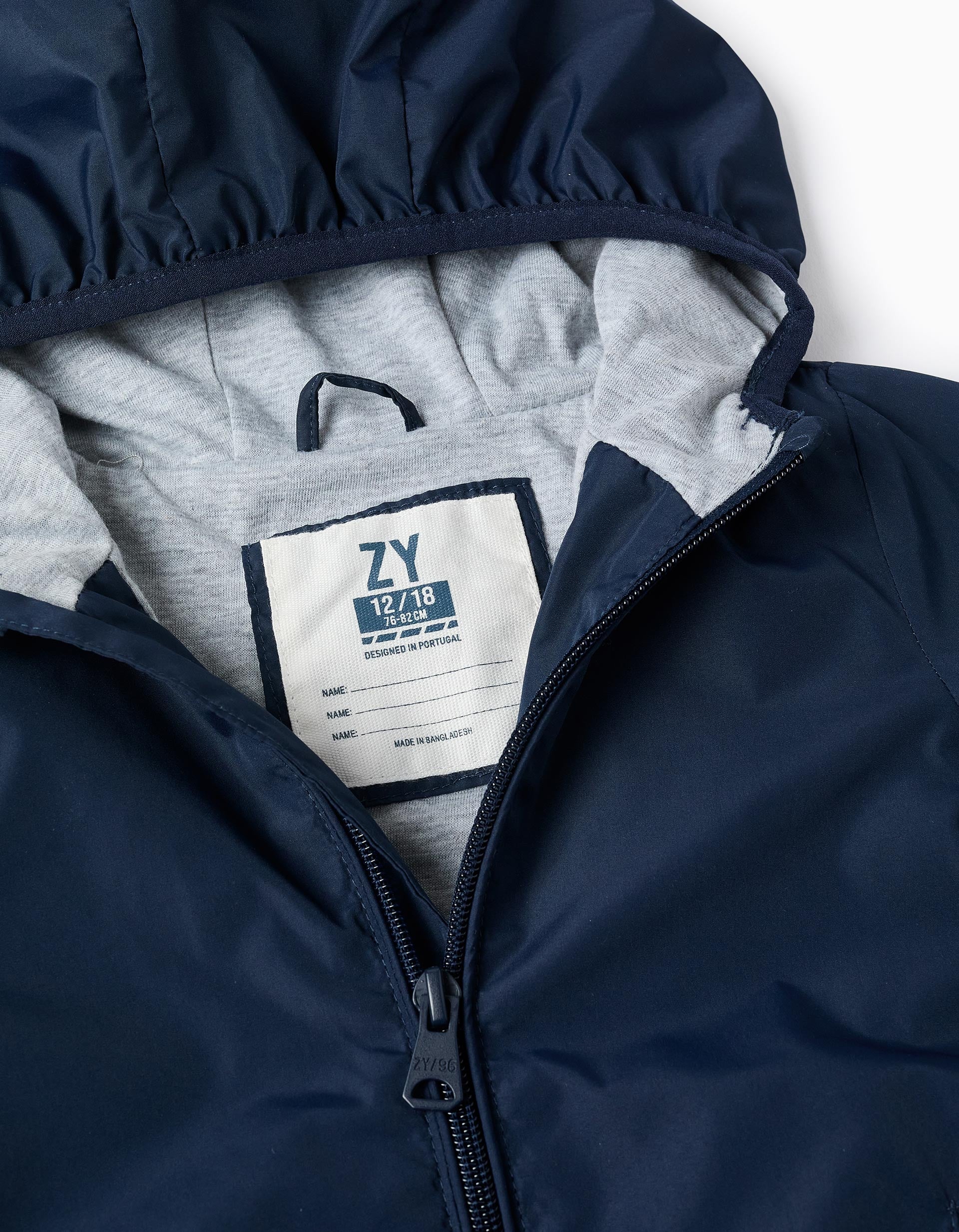 Cortavientos azul oscuro con capucha para bebé niño, con forro de jersey suave gris. Bolsillos laterales. Elástico suave en los puños y el dobladillo para un ajuste perfecto. Etiqueta de goma en la manga. ¡La chaqueta ideal para la entretiempo!