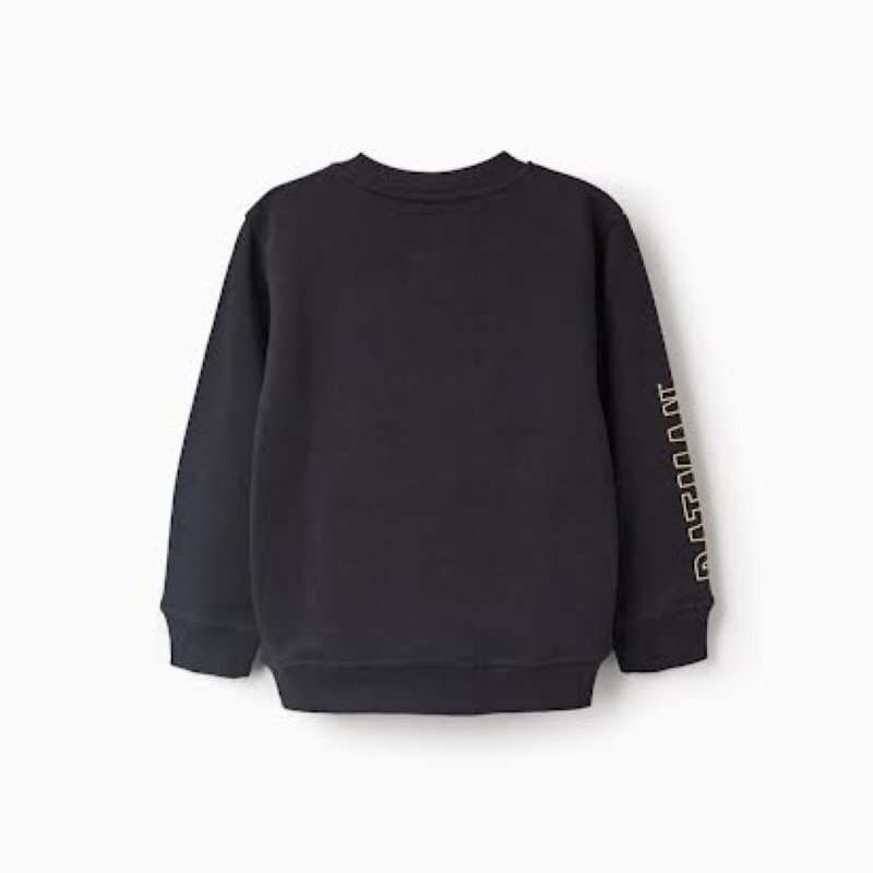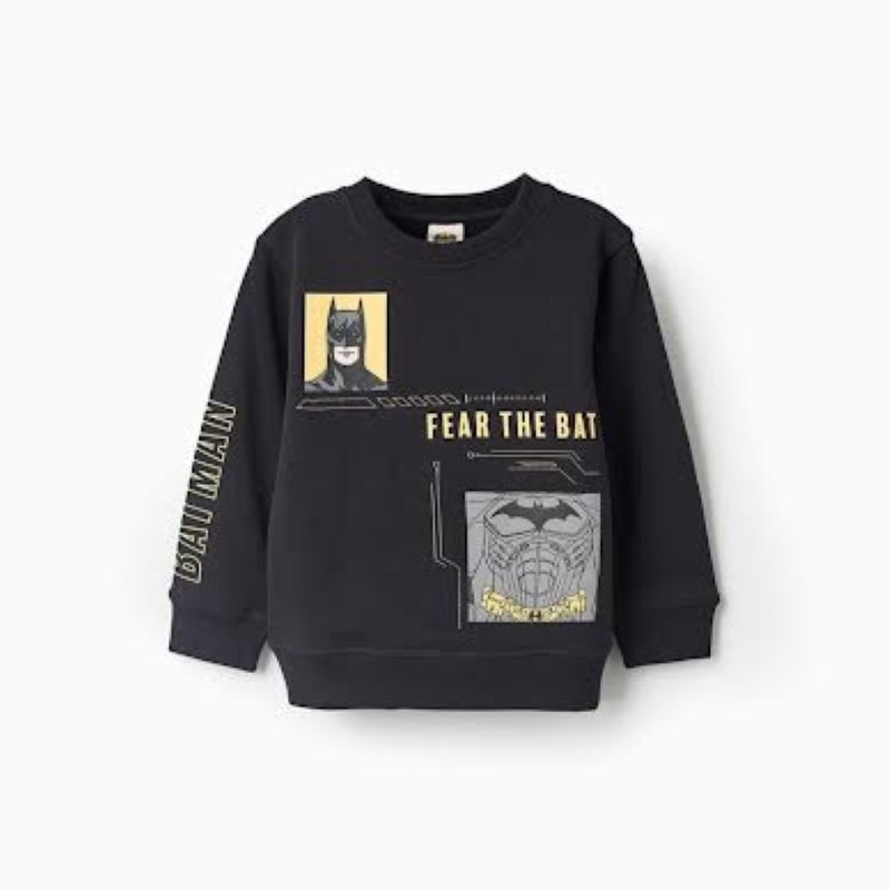 Sudadera negra para niño, 100% algodón, con interior perchado para mayor confort térmico. Estampado de batman en el frente y en una de las mangas. Cuello, puños y bajo acanalados para un ajuste perfecto.